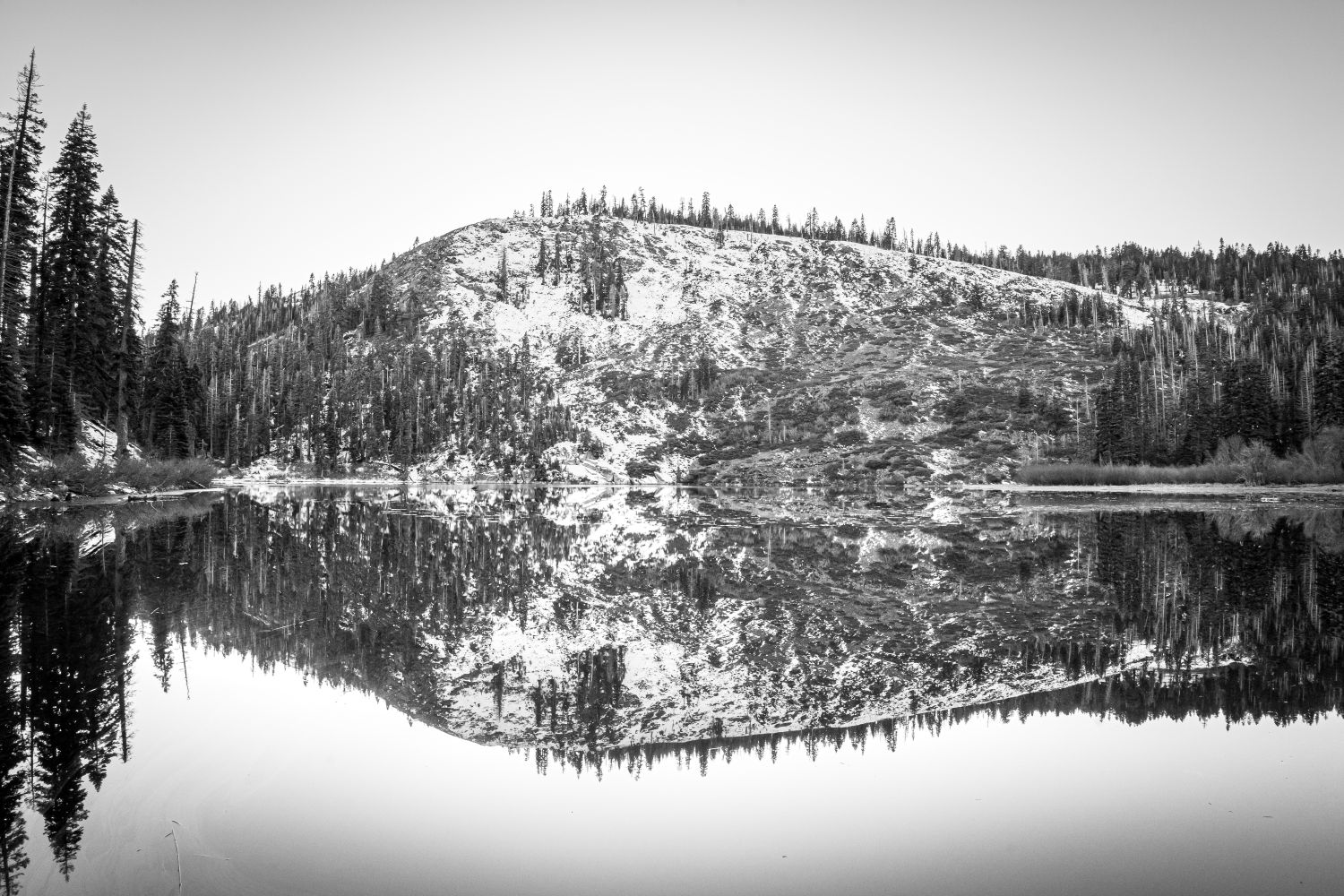 A snowy mountain reflects over Quail Lake, Homewood, CA. Black and White.