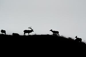 A bull elk and cow elk have a fierce stare down during the rut in Point Reyes, CA.