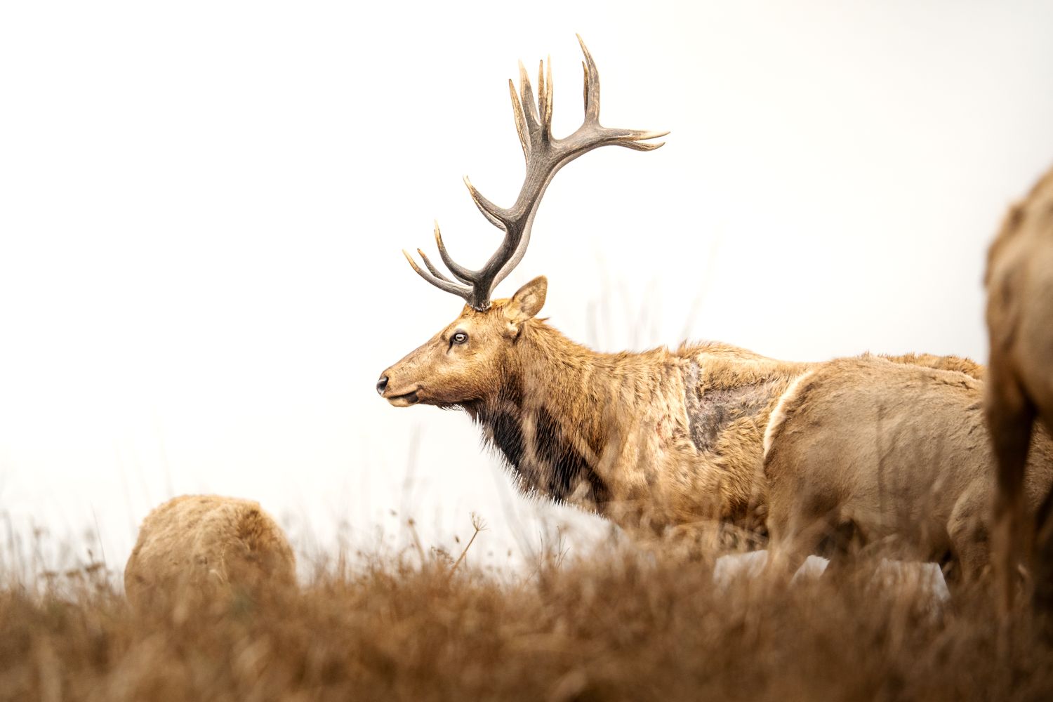 A bull elk guards his herd, visibly scarred from previous altercations.